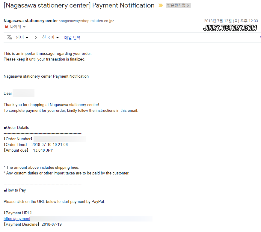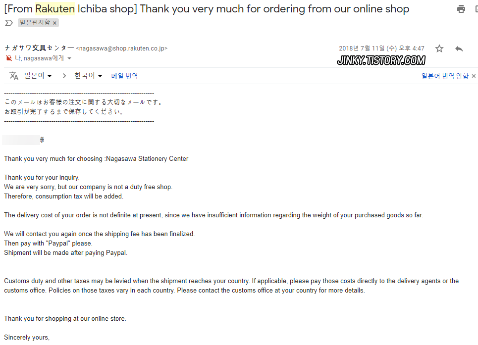 라쿠텐 글로벌에서 페이팔 결제는 처음이고 저번에 다른샵에서 카드결제 했을때 확인 메일을 보내지 않아서 그런지 배송 예정일보다 1주일이 늦게 발송되어서 혹시라도 이번에도 지연이나 취소가 될까봐 주문 내용은 맞고 소비세는 내야하는지, 결제는 언제 하는지 답메일로 물어봤다.