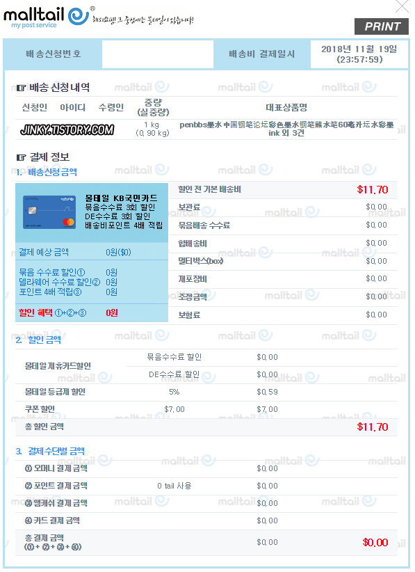 배송비는 1kg 11.7달러 측정되었음.