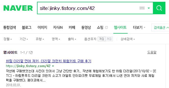 현재 블로그명으로 뜨던것들은 모두 수정했는데 네이버에 site:jinky.tistory.com으로 검색해보면 얼마나 수집되었는지 확인해볼 수 있다. site:자기 블로그 주소 형식으로 입력하면 됨. 처음에 60건밖에 없어서 첫번째 게시물부터 수집요청을 하니 수집되었다.