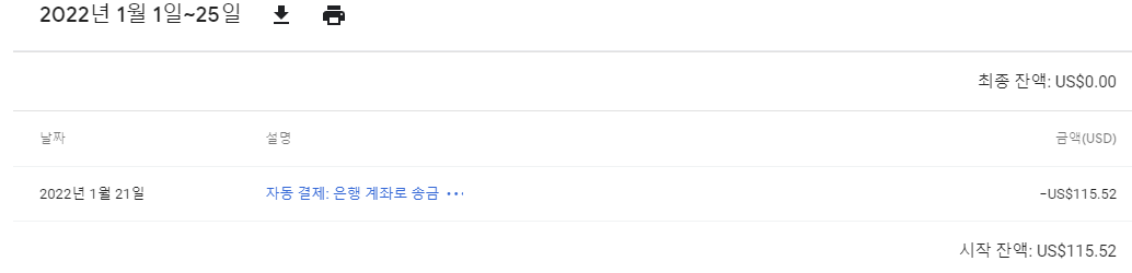 115.52달러 지급되었는데 수수료 제외하고 107.07달러 입금되었다.