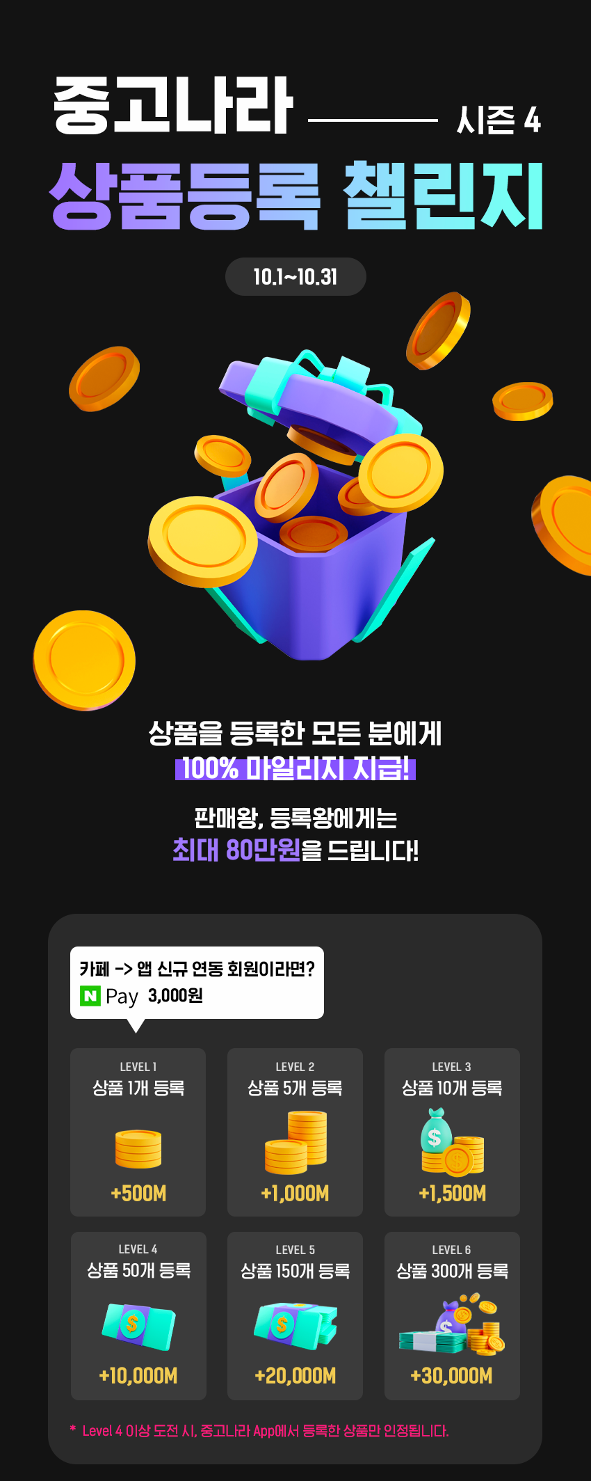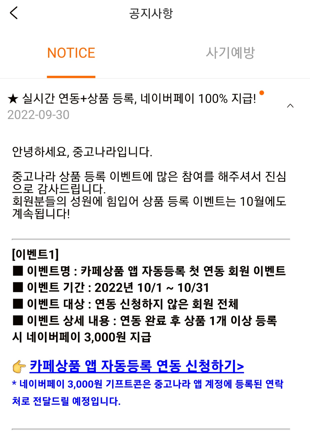 중고나라 카페와 연동, 상품 1개 등록하고 네이버페이 3000포인트 받기